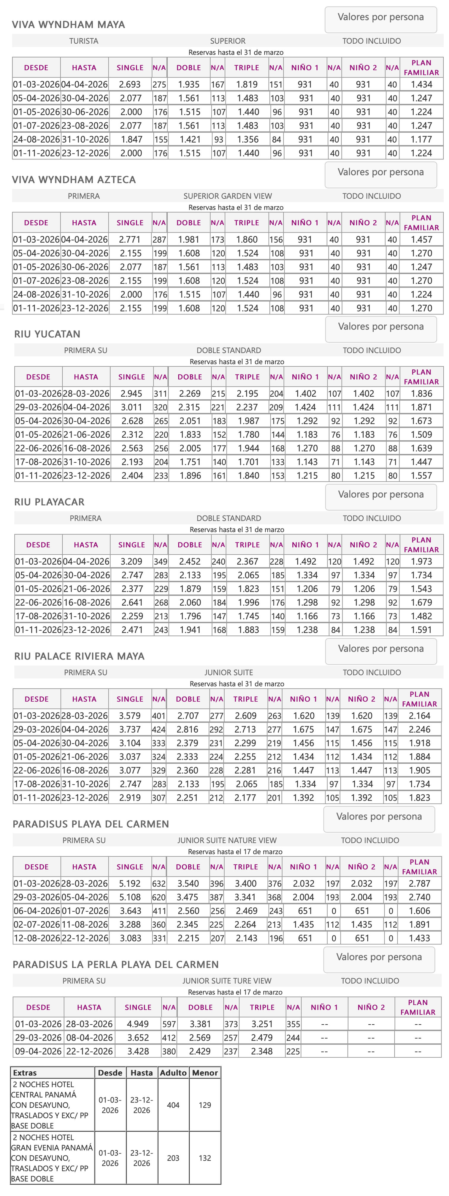 Programas no incluyen impuestos ambientales de México valor aproximado USD 3 por habitación por noche, se debe pagar en destino.